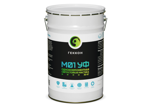 Геккон М01 УФ - Стойкая к УФ излучению однокомпонентная полиуретановая композиция холодного отверждения, полимеризующаяся под воздействием естественной влажности воздуха с образованием бесшовного покрытия в виде прочной резиноподобной пленки на различных изолируемых поверхностях. От ряда прочих полимерных покрытий отличается относительно малой чувствительностью к погодным факторам, позволяющей наносить бездефектные покрытия в условиях сырости, тумана, низкой температуры окружающего воздуха и изолируемой поверхности, без учета точки росы. Химический состав позволяет нанесение покрытия толщиной в несколько мм. без образования газовых пузырьков, снижающих качество пленки. Мастика в специальном исполнении может обладать свойствами защиты от бактерий и биологического разрушения. Такие свойства обусловлены использованием наноразмерных минеральных и металлических частиц с модифицированной поверхностью.